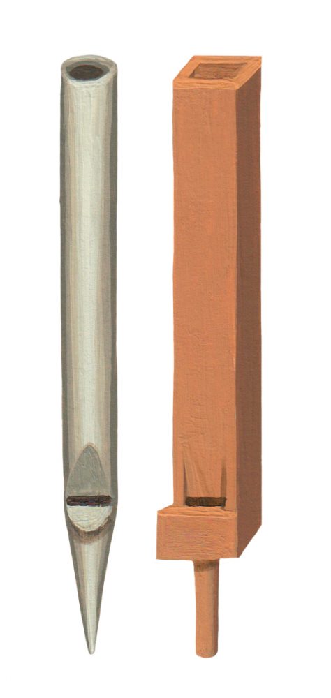 Zungenpfeifen sind gegenüber klimatischen Veränderungen besonders sensibel und müssen häufig gestimmt werden. Mit einem Stimmeisen wird die Zungenpfeife an der kleinen „Krücke“, die oben herausschaut, gestimmt.